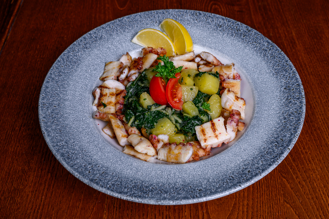 lignje, bareni krompir sa blitvom, grilovani čeri paradajz