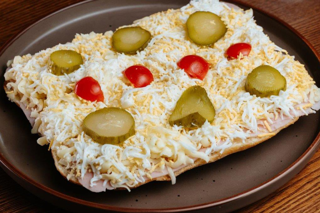 ćabata, jaje, pizza šunka, sir, majonez, čeri paradajz, kiseli krastavci